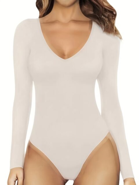 1pc Women’s Ribbed Tummy Control Shaping Lightweight Warm Bodysuit, Long Sleeve Round Neck Design, Seamless Comfort, Fitted, Soft Stretch Fabric, Perfect for Daily Wear