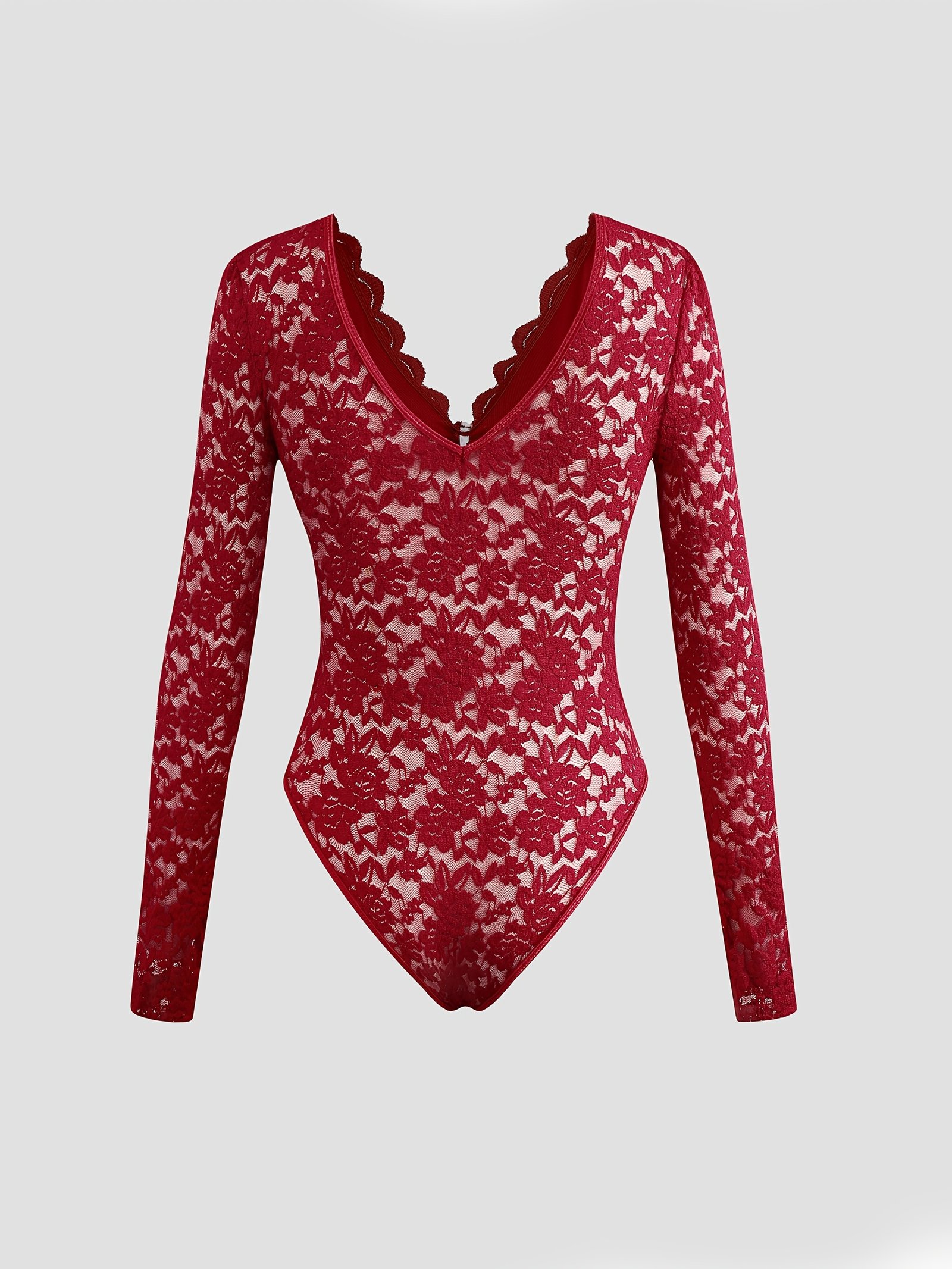 Sexy Solid Color Lace Long Sleeved See-through Slim Bodysuit.