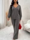 Solid Color Jacquard Lace-up Long Sleeve Top and Straight Leg Pants Homewear Two-Piece Set
