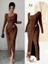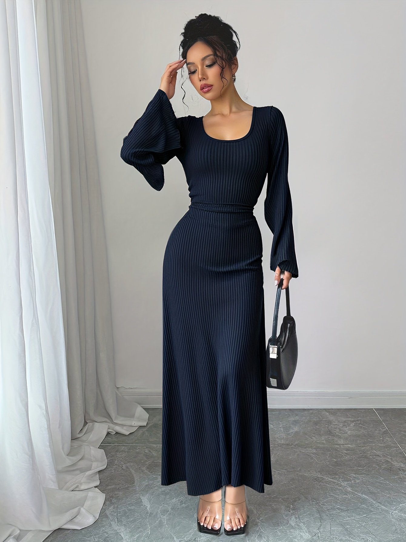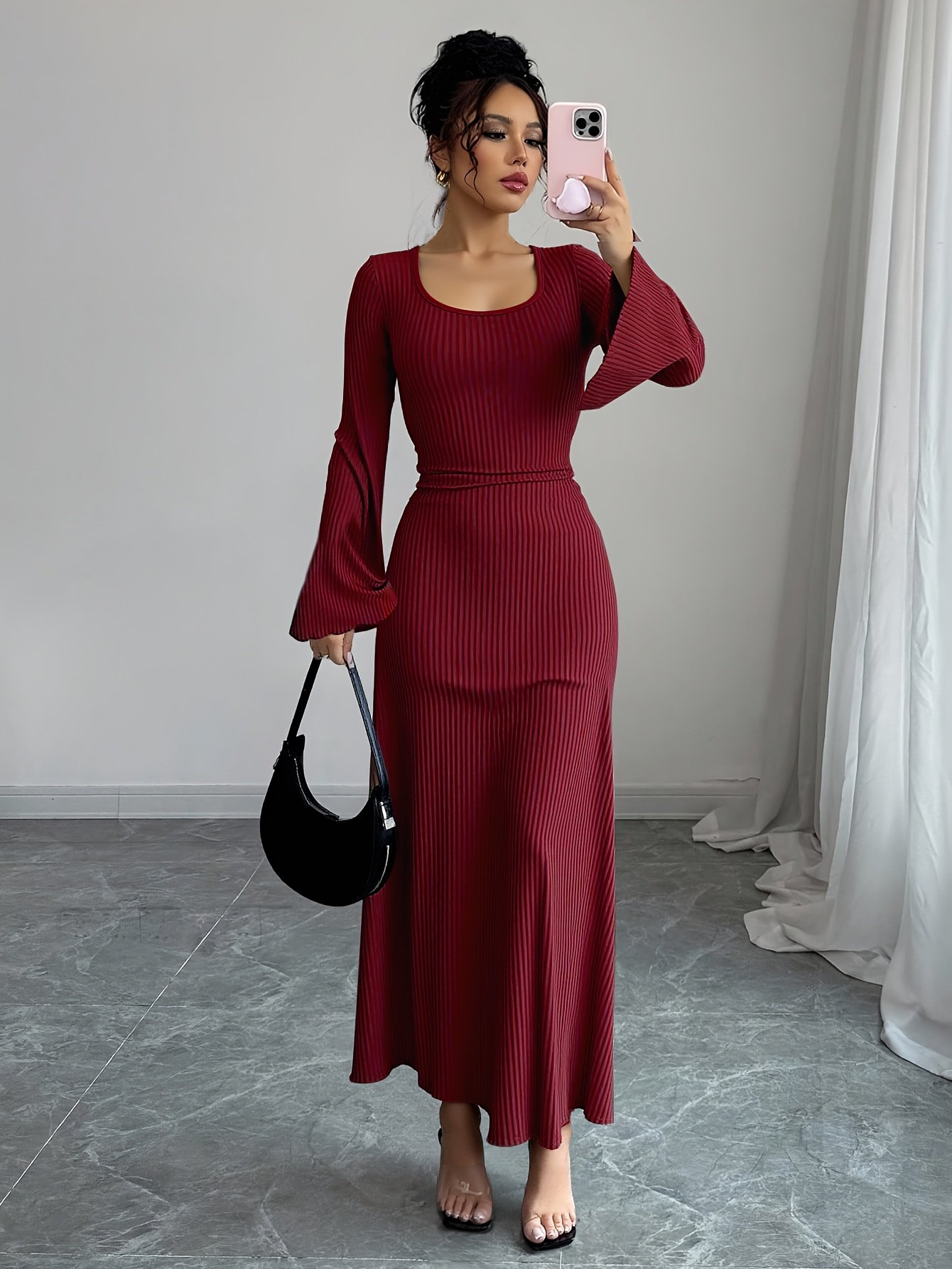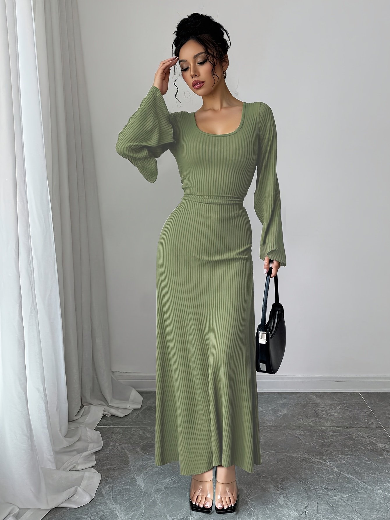Traditional Long Dress for Women with Solid Color Ribbed Flared Sleeves And a Tie at The Back, Suitable for Ramadan