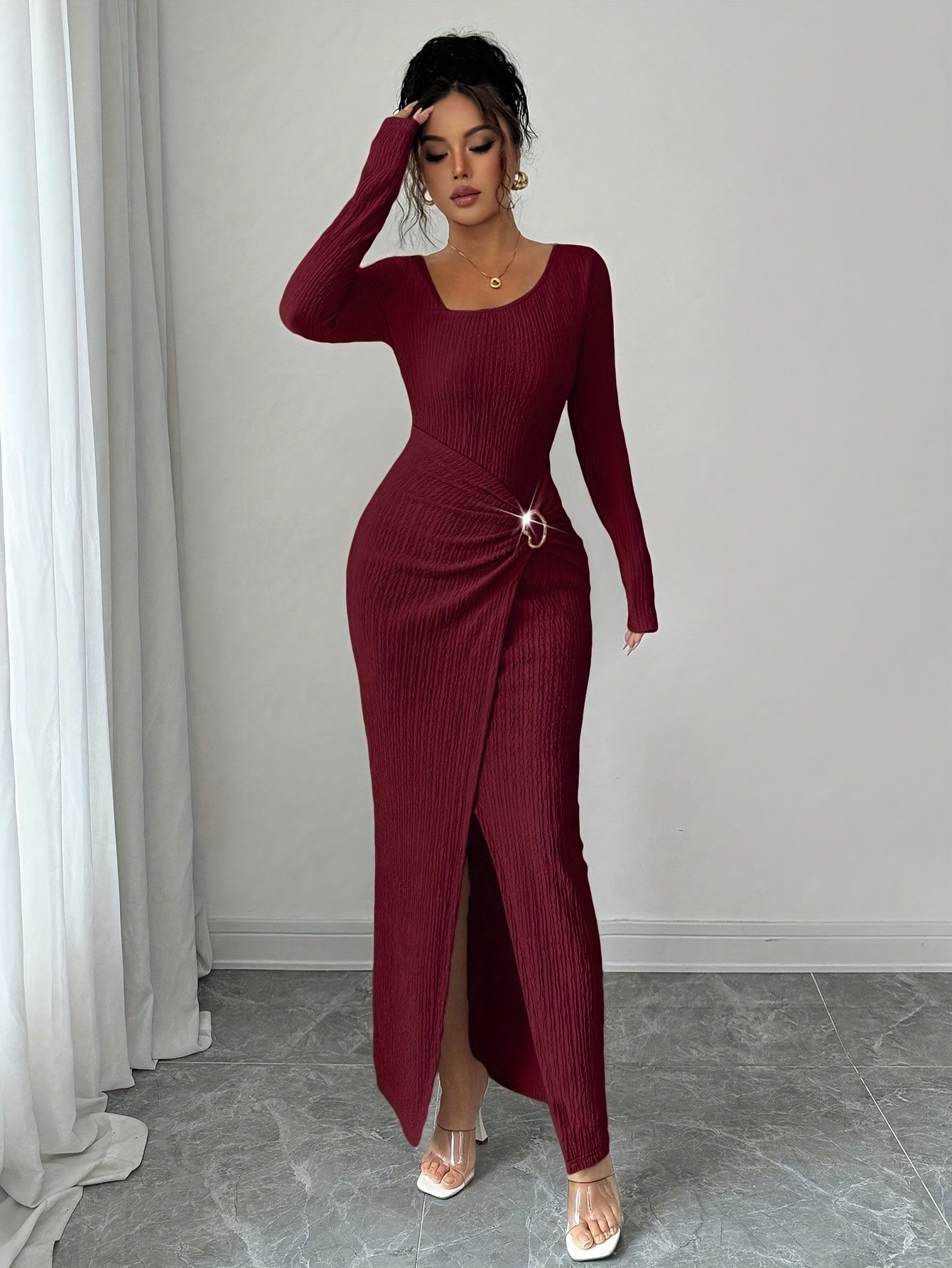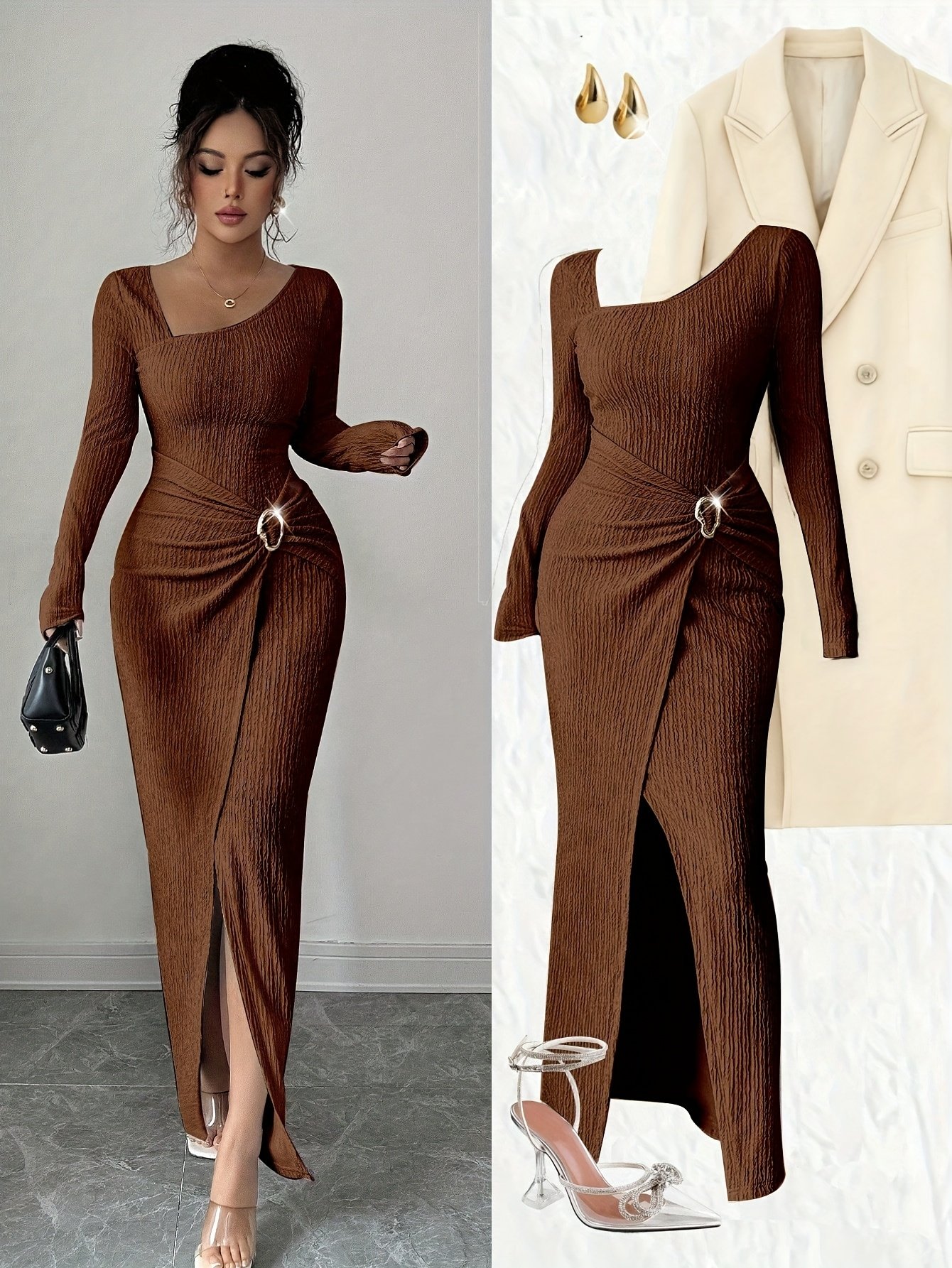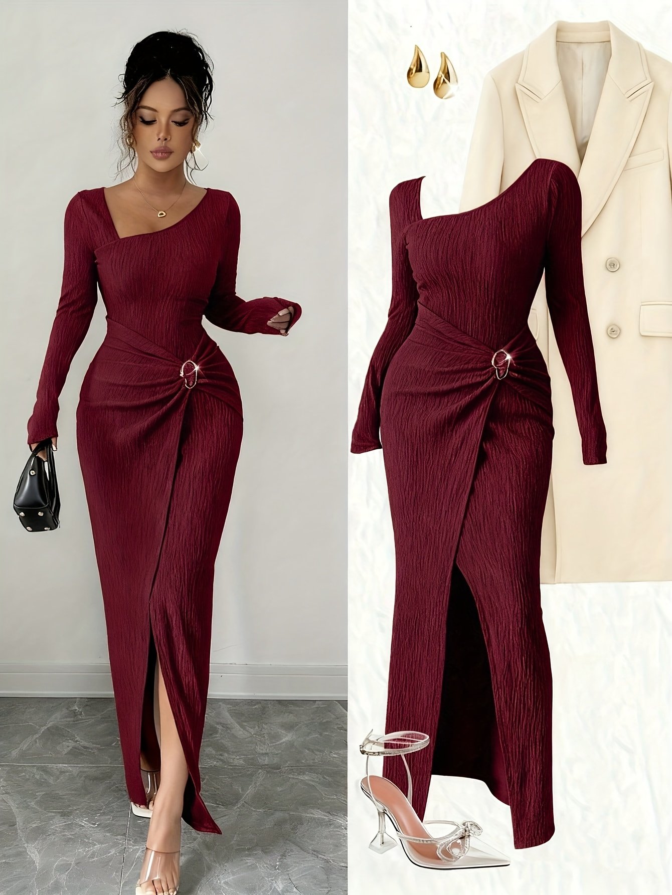 Women's Elegant Asymmetrical Twist Hem Dress - Long Sleeve Winter Wedding Guest Gown, Bodycon Fit with Asymmetrical Neckline & Slit, Machine Washable Fall/Winter Formal Party Dress (Solid Color, No)