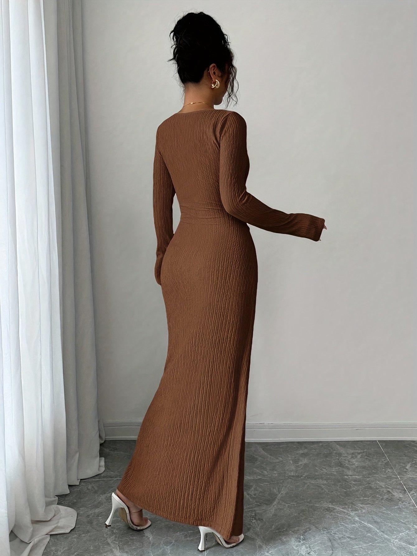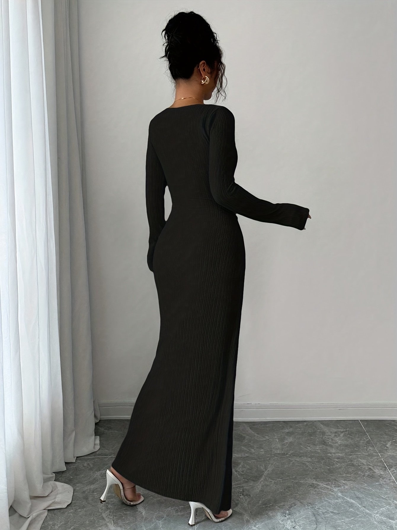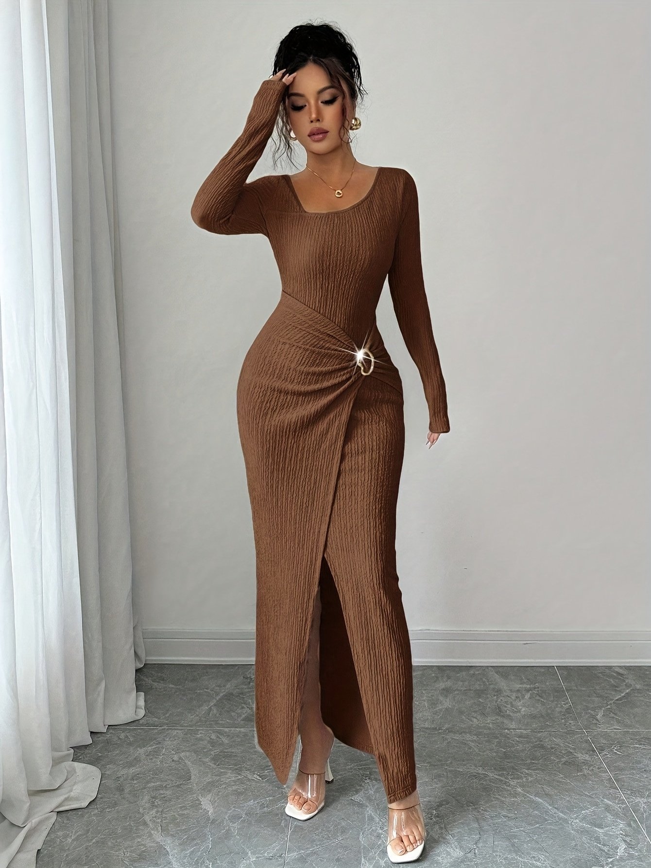 Women's Elegant Asymmetrical Twist Hem Dress - Long Sleeve Winter Wedding Guest Gown, Bodycon Fit with Asymmetrical Neckline & Slit, Machine Washable Fall/Winter Formal Party Dress (Solid Color, No)