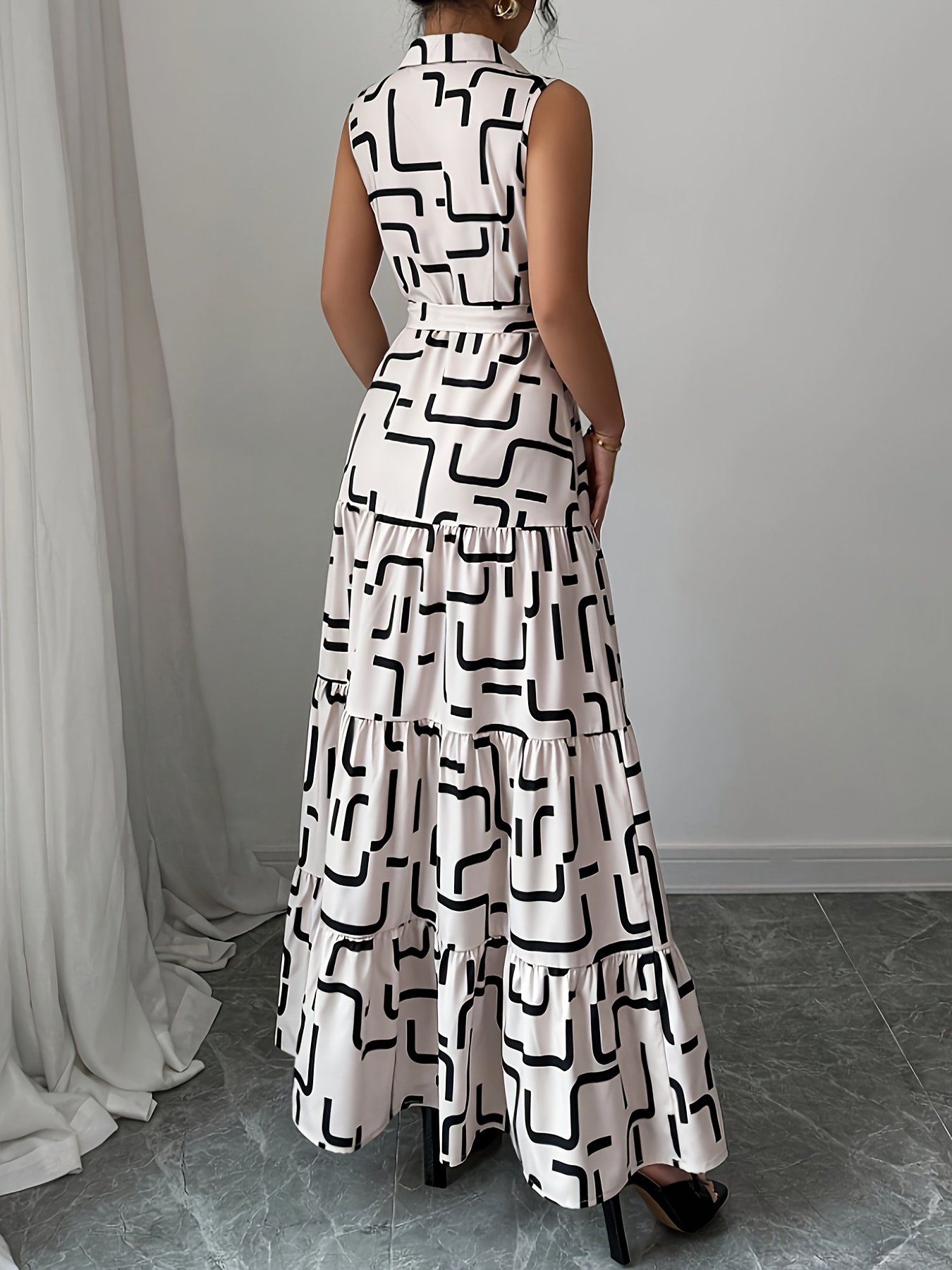 Add to cartWomen’s Elegant Geometric Print Button-Front Tie-Waist Maxi Dress, Spring/Summer Fashion Versatile Lapel Sleeveless Dress, Women’s Clothing