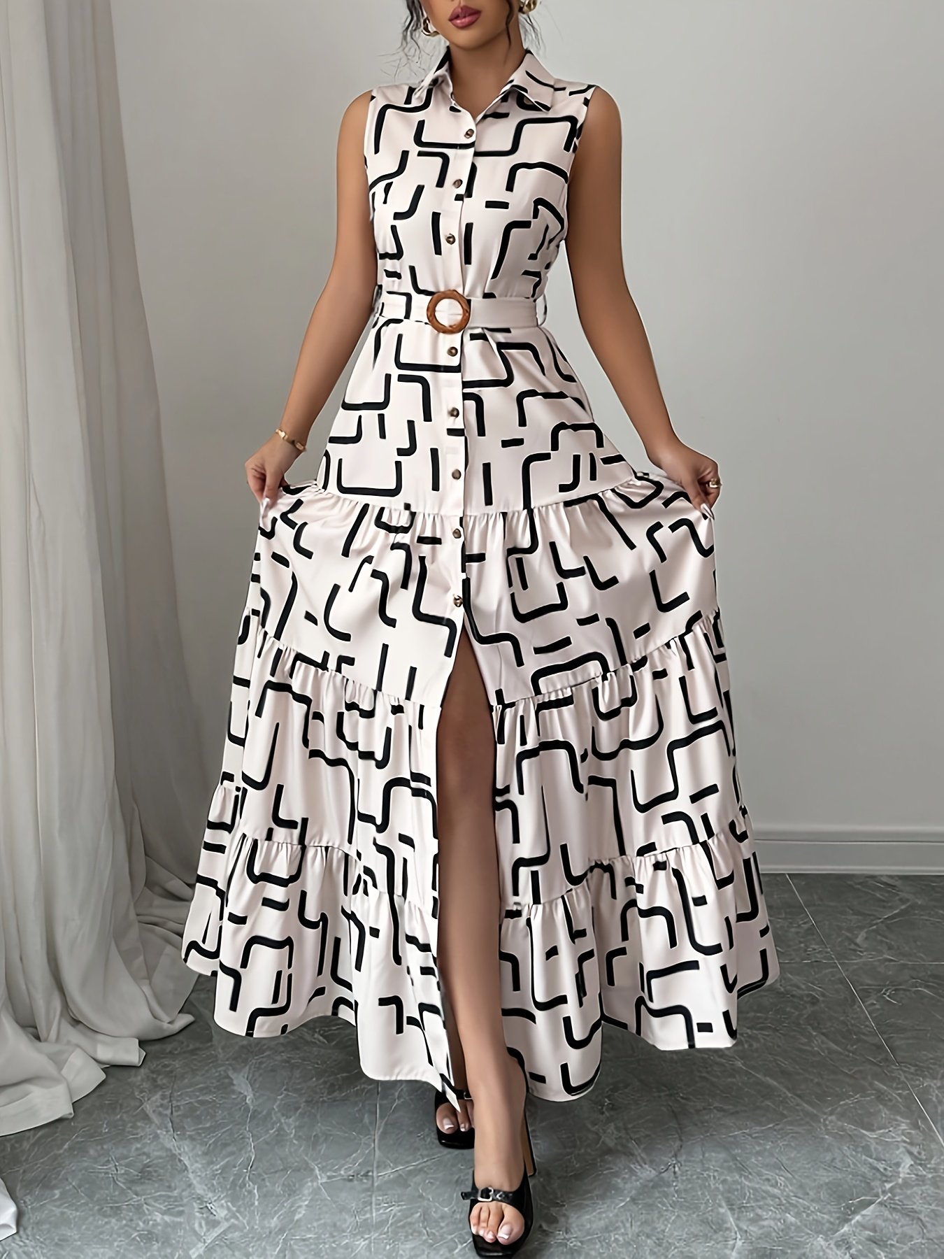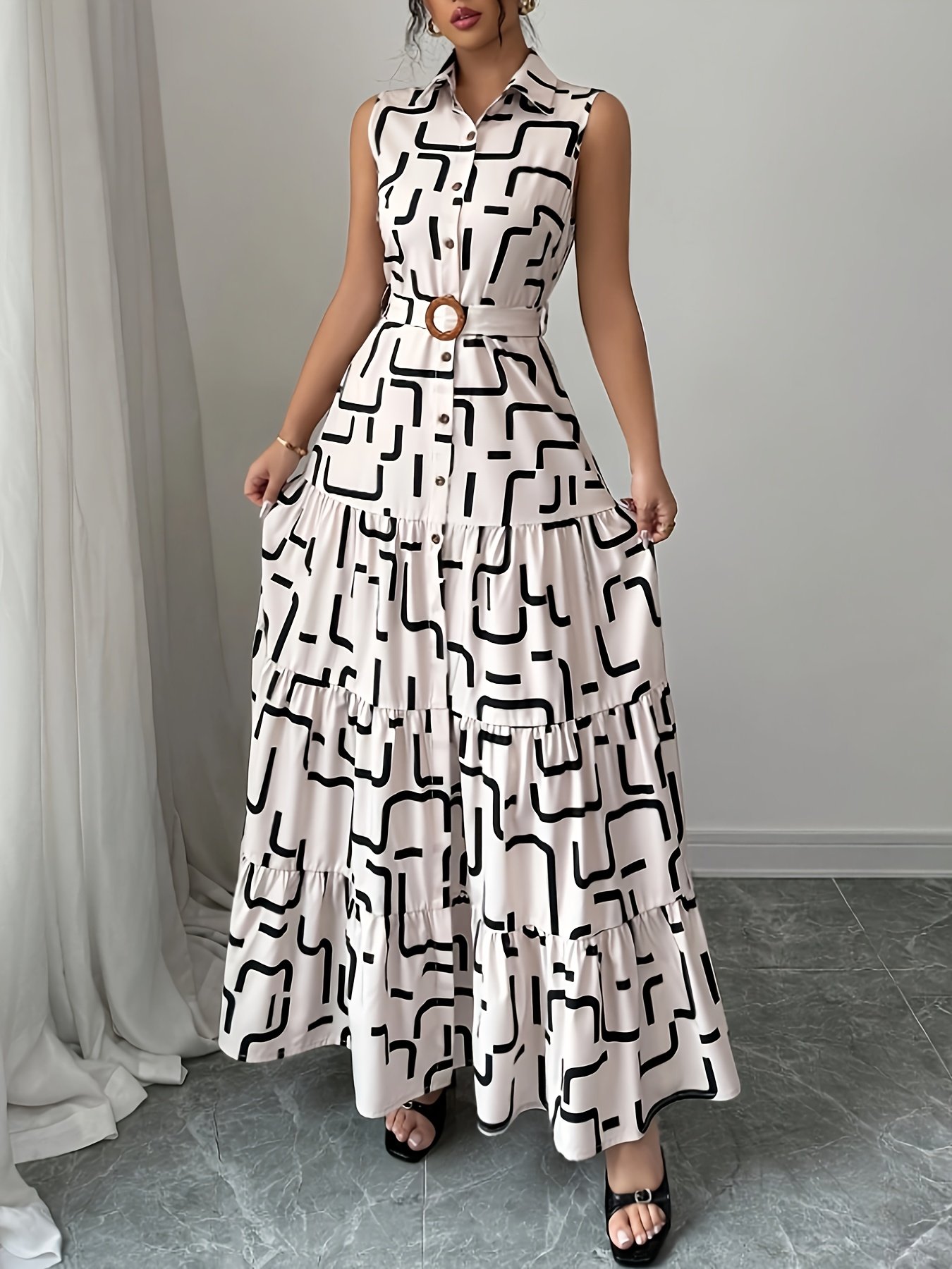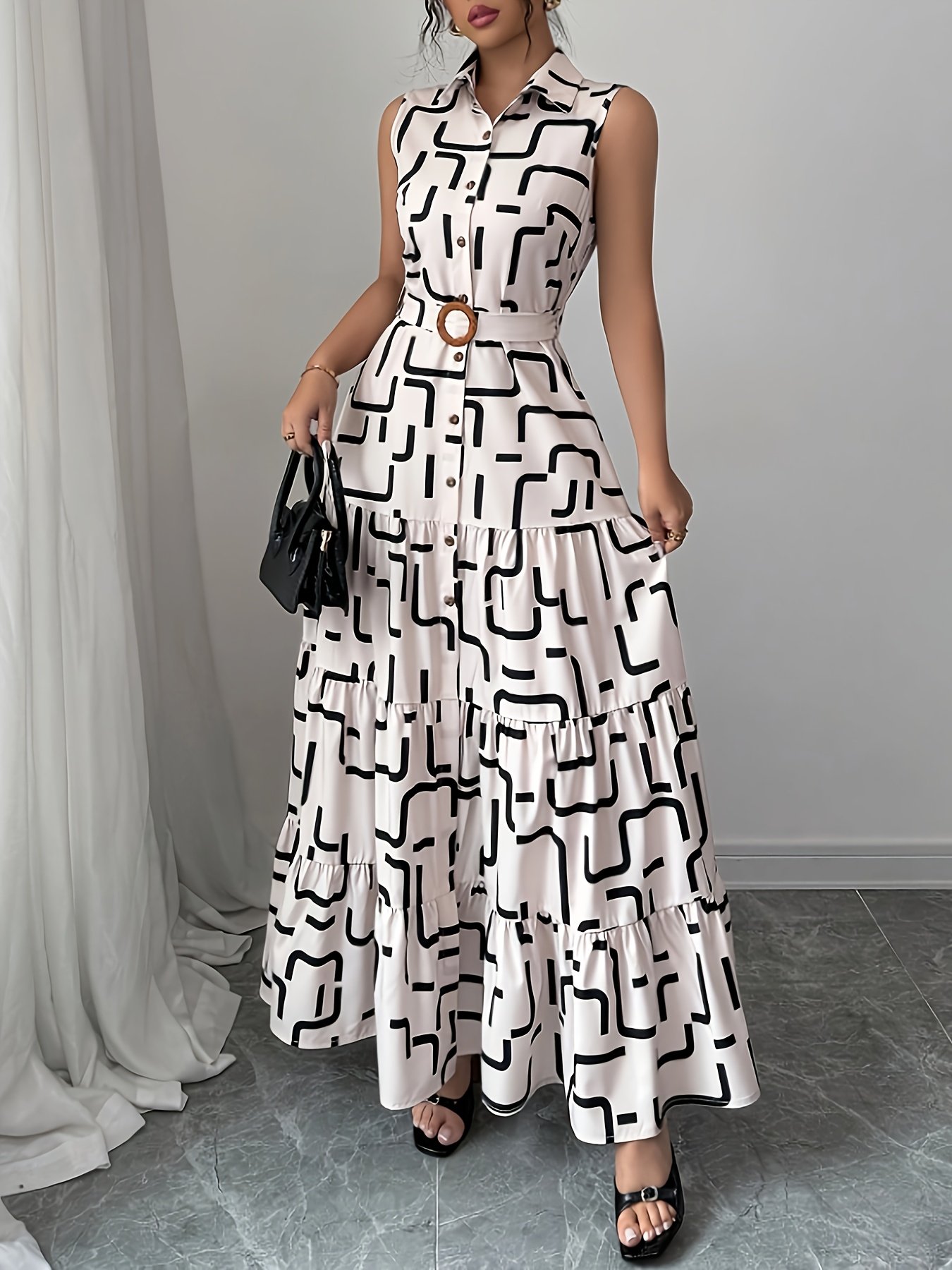 Women's Elegant Geometric Print Button-Front Tie-Waist Maxi Dress, Spring/Summer Fashion Versatile Lapel Sleeveless Dress, Women's Clothing
