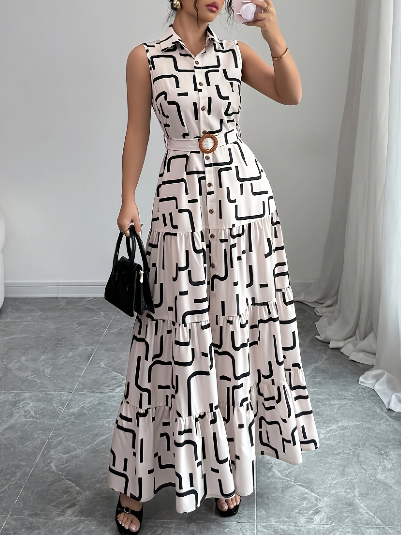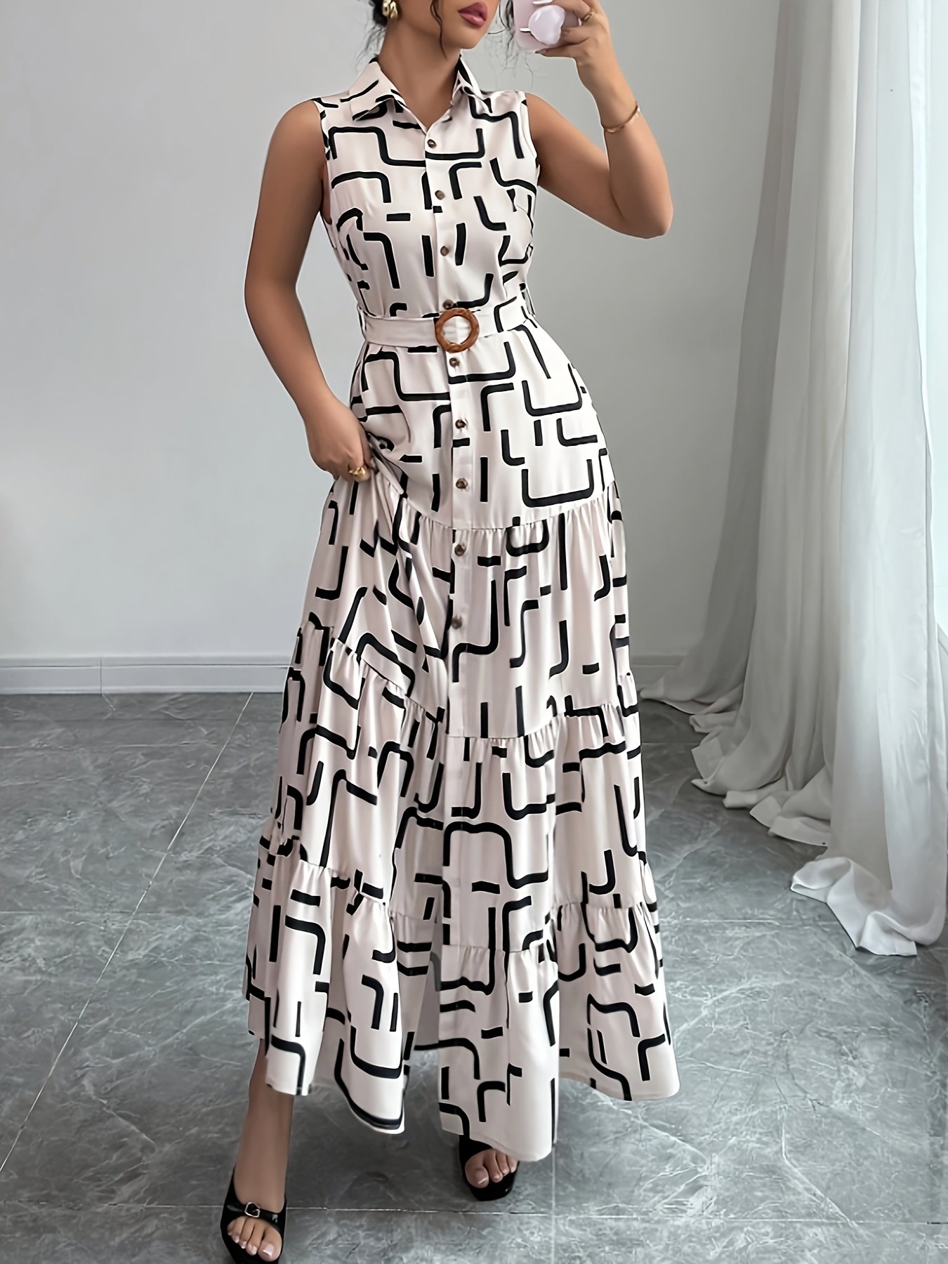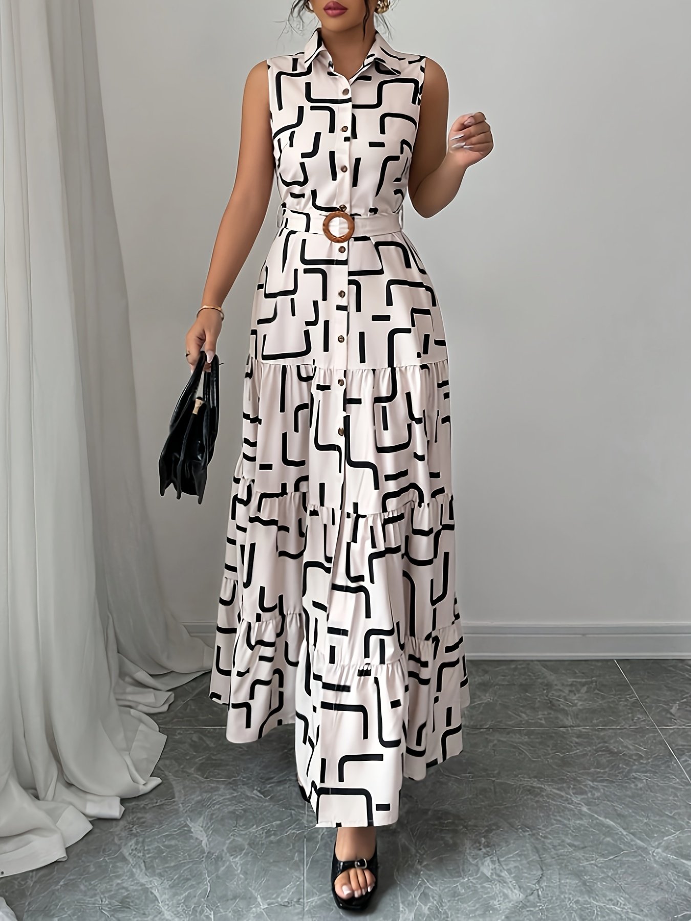 Women's Elegant Geometric Print Button-Front Tie-Waist Maxi Dress, Spring/Summer Fashion Versatile Lapel Sleeveless Dress, Women's Clothing